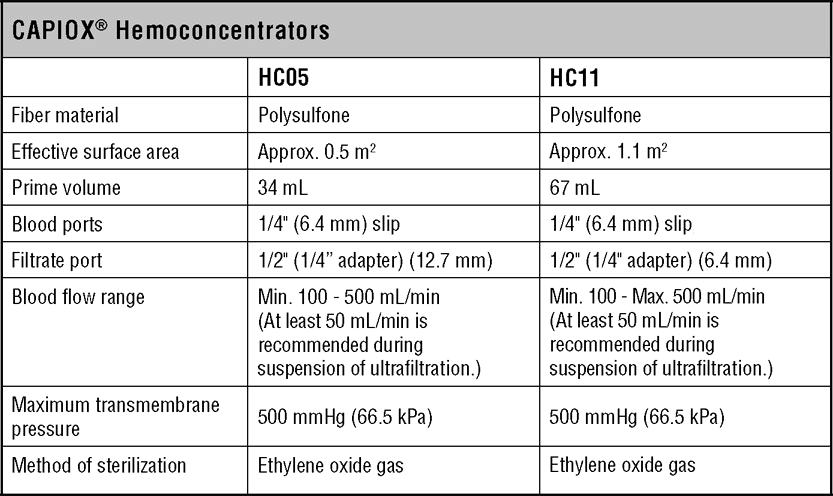 | 1CX*HC11S | Hemoconcentrator, 1.1 m2, 100 - 500 mL/min, with 1/4" slip connector | 10 |
