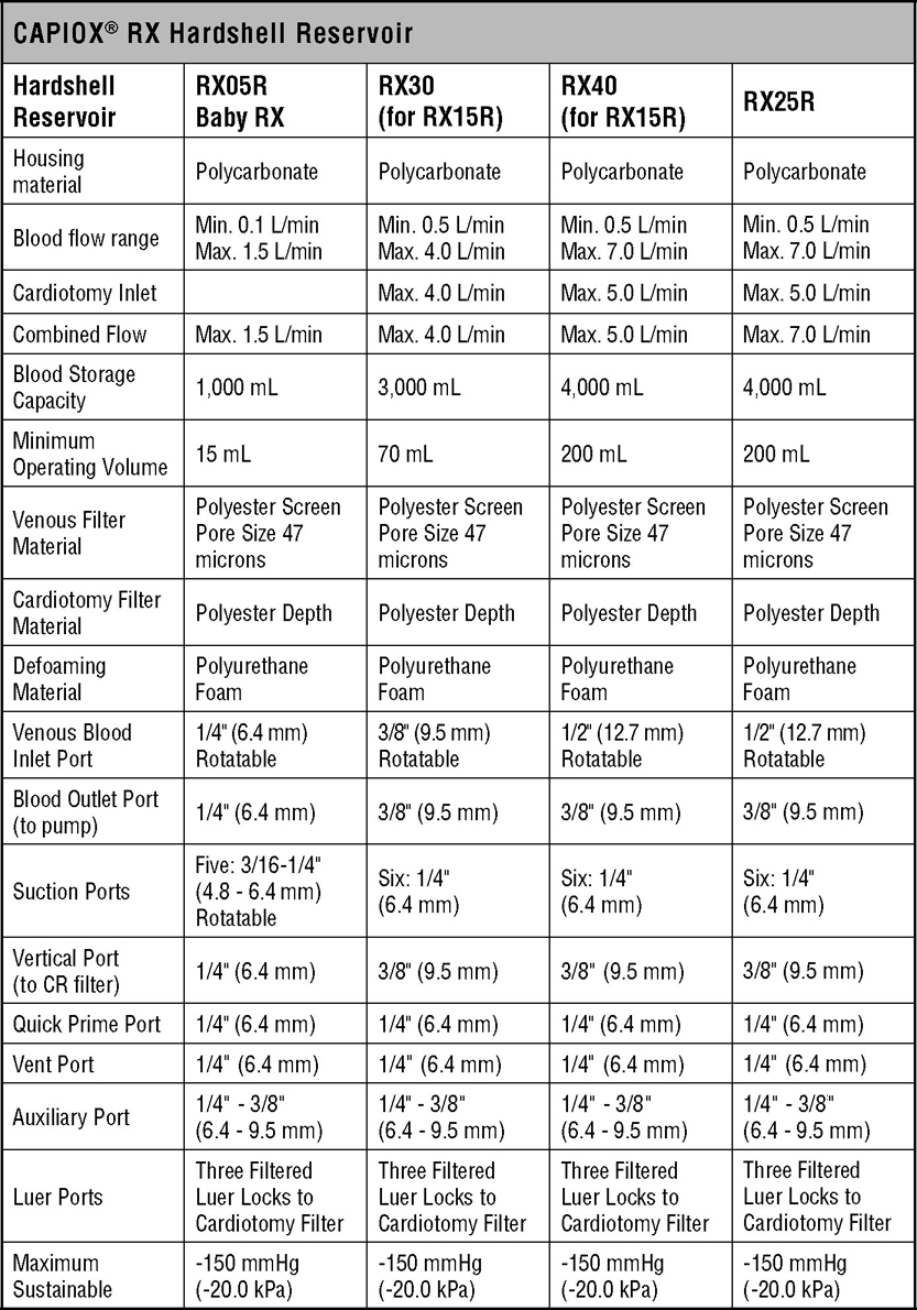 | 1CX*RX05RWA | Oxygenator, 0.5 m2 surface area, 0.1 - 1.5 LPM flow rate, with hardshell reservoir, with Xcoating™ surface coating Oxy inlet on right when outlet is facing away from user | 4 |
